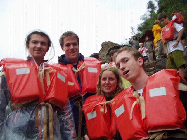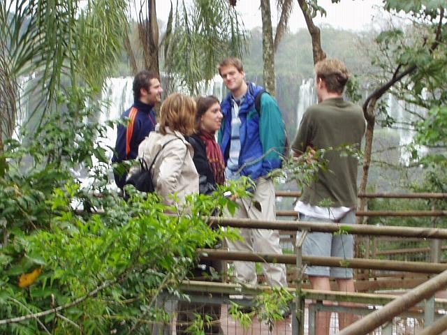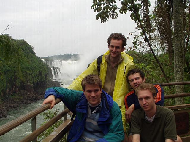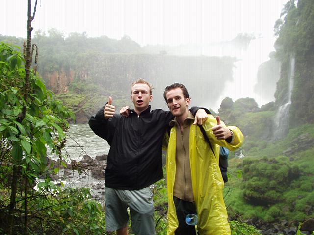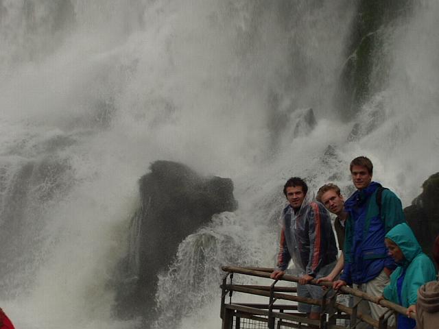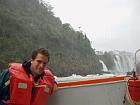 Dieser Mann da links ist voll und ganz dafür verantwortlich, wie wir unser Leben in den Wasserfällen riskiert haben! Schon Lars hat uns von der "Gran Aventura" erzählt, einer Speedboattour durch die Wasserfälle. Mr. NiceGuy links wollte uns diese auch andrehen. Eigentlich hatten wir uns ja schon vorher dagegen entschieden. Mit geschickten Verkaufstaktiken aber schafft er es ("ok, I see you have prejudice, you don't want. Ok, I just tell you, it's a question of time and space. You're here once in your life...") dass wir uns in einer 20minütigen Diskussion für nichts entscheiden und die Münze werfen... Mit dem zweiten Wurf (erste Münze verschwindet in einem Gitter) hat leider der Typ verloren und wir machen uns ab und weg. | ||