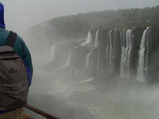 Wettermässig sieht es heute nicht unbedingt besser aus, immerhin könnte es trockener werdn als gestern, von Sonne aber leider kaum eine Spur. Oben sieht man die Action-Eisenbahn, die uns galant und im Schneckentempo durch den Park zur Höllenschlucht fährt. Mit uns ist auch noch ein ziiiiieeeeemlicher Ami aus San Francisco, den wir schon am Busbahnhof von Puerto Iguazu kennengelernt haben - nicht wirklich unsere Traumbegleitung. Aber irgendwann werden wir ihn auch wieder los... | |